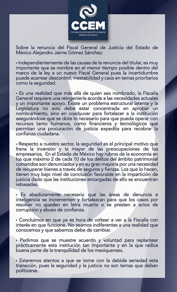 A través de un comunicado de prensa, el Consejo Coordinador Empresarial del Estado de México (CCEM) dio a conocer su preocupación por la renuncia del hasta hoy Fiscal General de Justicia del Estado de México, Alejandro Jaime Gómez Sánchez, y solicita se nombre a brevedad a su sucesor, porque el tema de seguridad es el principal asunto que frena la inversión y es la mayor preocupación de los integrantes de la iniciativa privada.