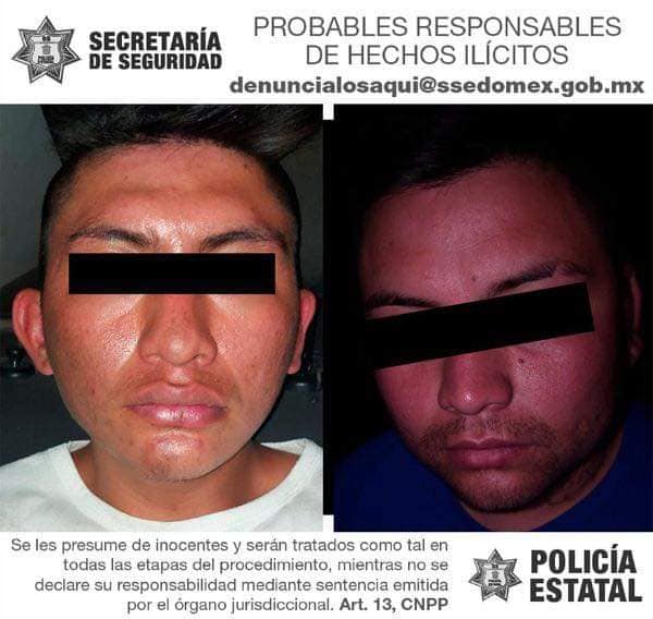 Ante la denuncia, elementos de la Secretaría de Seguridad del Estado de México aprehendieron a ese par de personas, José “N” y Brandon “N”, de 26 y 21 años de edad respectivamente, en la calle de Alcatraz de la referida colonia, los cuales pretendían huir a bordo de un Tsuru color azul con el efectivo y la motoneta.